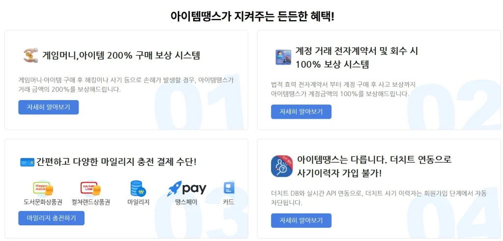 - 200% 구매 사고 보상: 플랫폼 내 정상 거래 중 사고 발생 시 구매 대금의 2배를 보상합니다.
